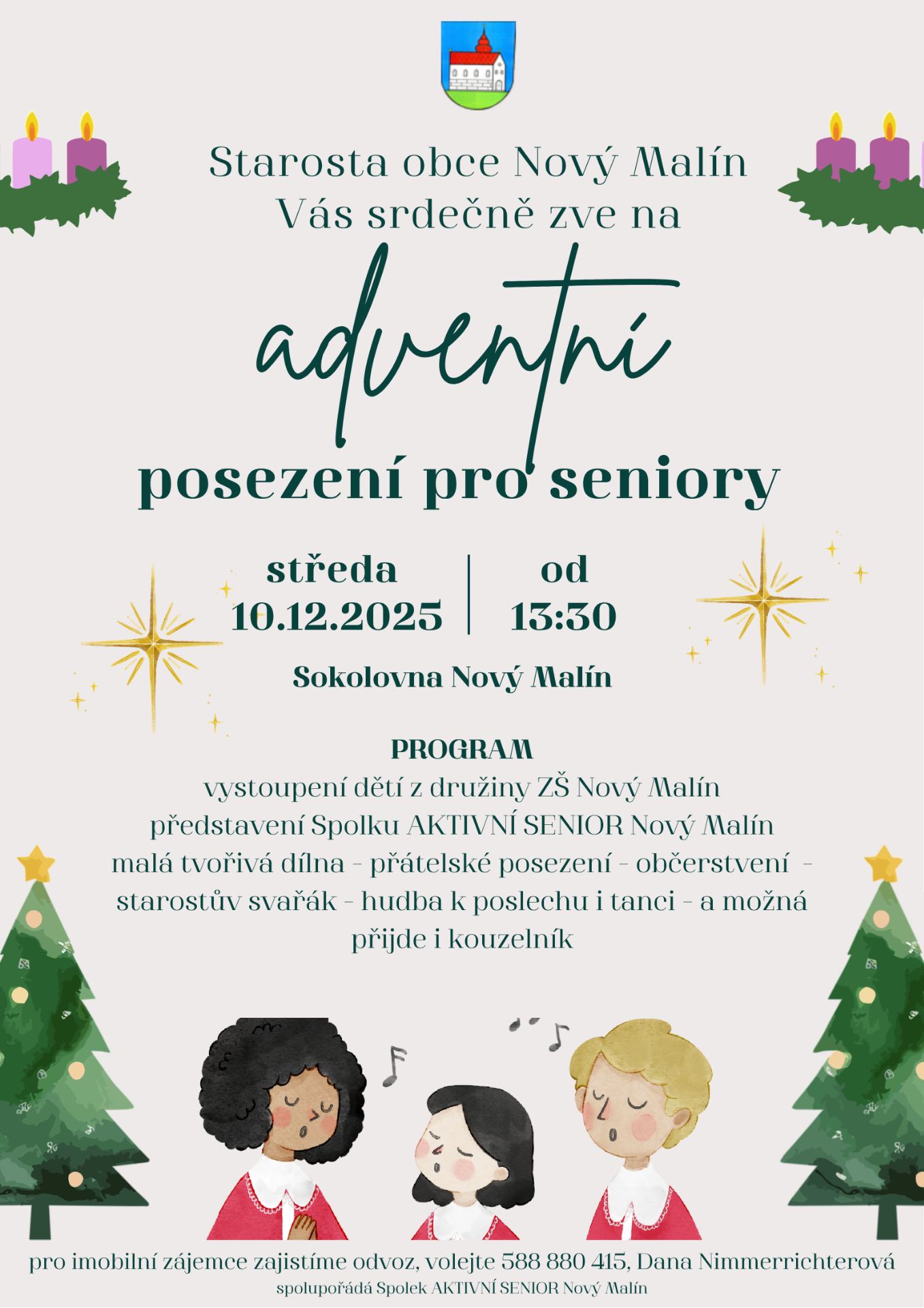 V polovině prosince loňského roku měli senioři z Nového Malína a Mladoňova možnost se sejít v Sokolovně, kde byl pro ně připravený odpolední předvánoční program. Sešlo se jich na 90 a celé setkání zahájil starosta obce Mgr. Marek Štencl pod jehož záštitou se tato akce konala. S adventním pásmem vystoupili již tradičně děti ze školní družiny ZŠ Nový Malín. Seniorům byla představena Univerzita třetího věku a další aktivity, které pro ně organizuje místní knihovna, projekt Munipolis a také záměr vzniku Klubu aktivních seniorů. K poslechu i tanci zahrála skupina Basta Fidli.